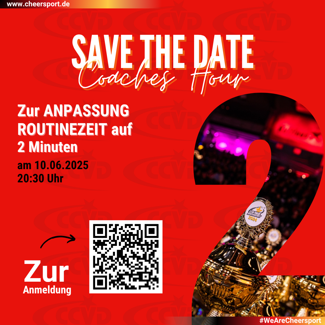 wie letzte Woche bereits über unsere Social-Media-Kanäle angekündigt, lädt Euch der Fachausschuss für Wettkampfwesen herzlich zur nächsten Coaches Hour am Dienstag, den 10. Juni um 20:30 Uhr ein. Thema ist die Anpassung der Routinezeit auf 2 Minuten in den Cheerleading–Kategorien.