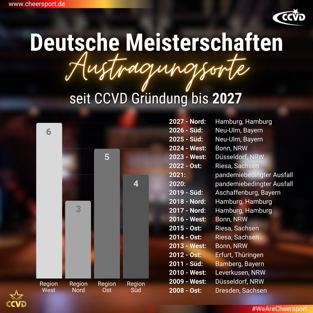 Seit der Gründung des CCVD haben zahlreiche Städte aus ganz Deutschland die offiziellen Deutschen Meisterschaften im Cheersport ausgerichtet.