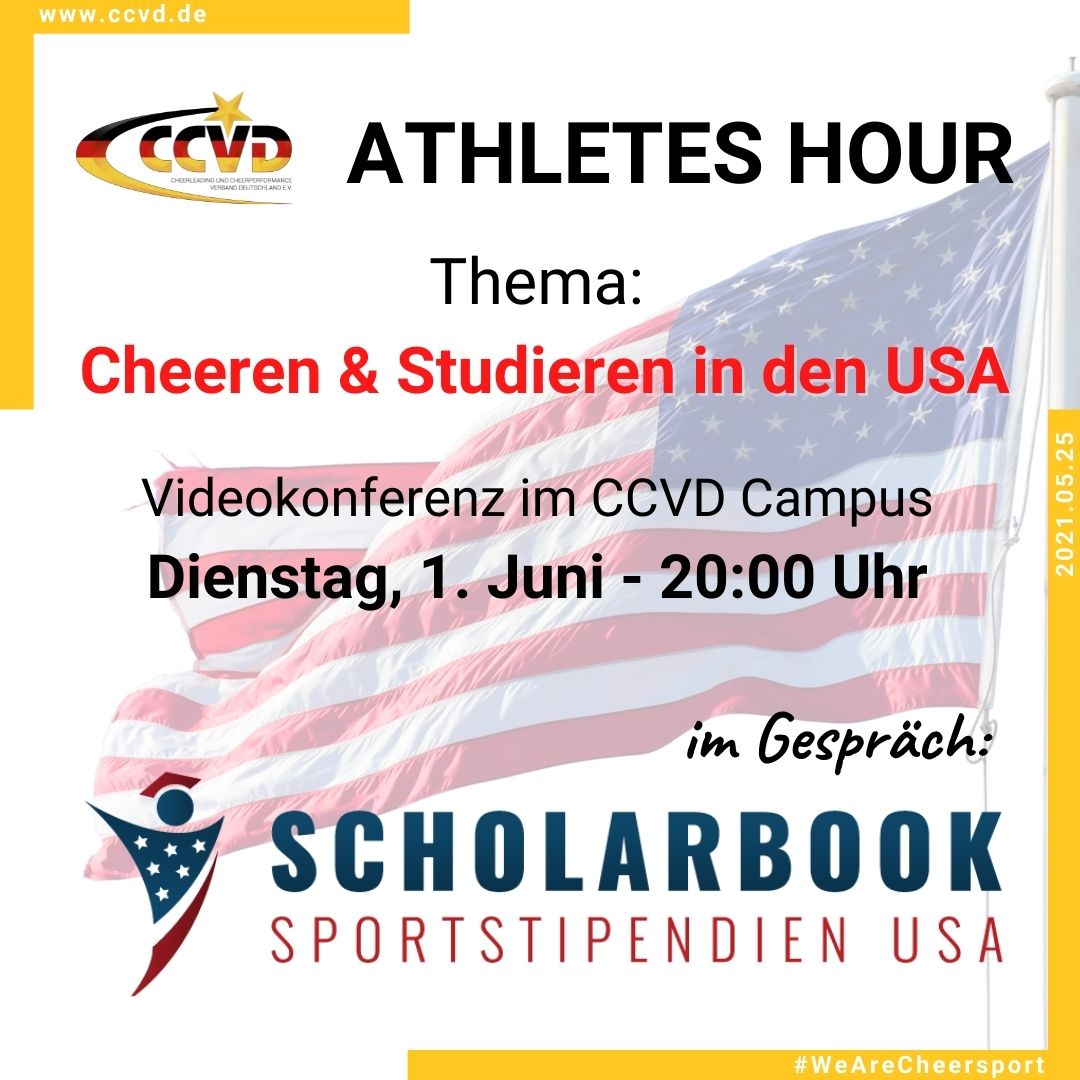 Du bist aktives Mitglied in einem CCVD Bundesliga Team und/oder Mitglied im Bundeskader, mindestens 14 Jahre alt, auf dem Weg zum (Fach-)Abitur und „Cheeren & Studieren“ an einer US-amerikanischen Universität sind ein Lebenstraum? Dann ist diese CCVD Athletes Hour wie für Dich gemacht!