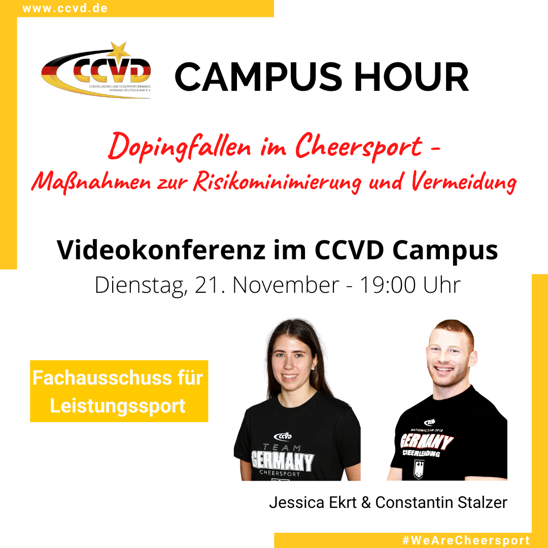 In der Campus Hour möchten wir auf Dopingfallen im Cheersport näher eingehen und wie diese vermeidbar sind. Das Angebot ist richtet sich an alle interessierten Vereine, TrainerInnen, SportlerInnen und Eltern.