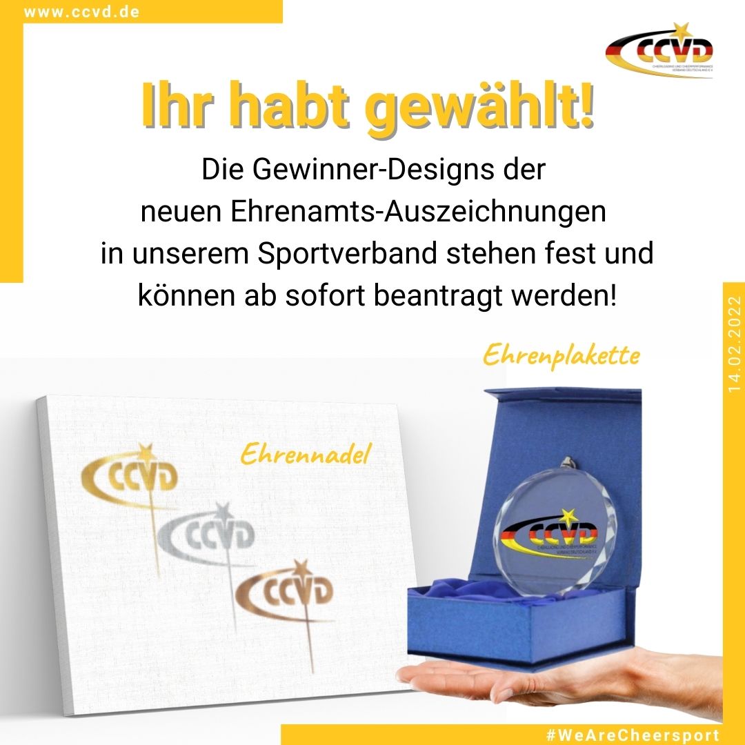 Ihr habt gewählt! Das Design der CCVD Ehrennadel (erhielt 50,4 % der Stimmen) und der CCVD Ehrenplakette (erhielt 51,5 % der Stimmen) stehen fest und die CCVD Ehrenordnung tritt damit ab sofort in Kraft. Bis zum 30. Juni des laufenden Jahres könnt Ihr nun jeweils die Auszeichnungen beantragen. Alle Details dazu findet Ihr in der CCVD Ehrenordnung im Download-Bereich der CCVD Homepage oder unter diesem Direktlink >hier.