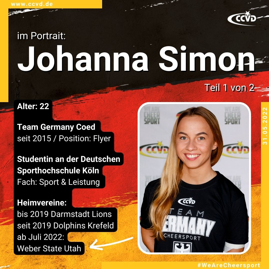 CCVD: In wenigen Wochen wirst Du, liebe Johanna, Cheerleading-Deutschland für eine Saison verlassen und ein Auslandsjahr in den USA absolvieren. Du hast durch Deine Leistung als Cheerleading-Athletin einen Platz in der derzeit erfolgreichsten US-Universitätsmannschaft inkl. Stipendium erhalten – und zwar an der Weber State University in Utah. Die Weber State University gewann 2022 das fünfte Mal in Folge den Titel in der Large Coed Division bei den NCA Collegiate Nationals in Daytona Beach, Florida und stellt seit vielen Jahren rund ein Viertel der Team USA Coed Athleten. Wie bist Du an den Platz im Team und das Stipendium gekommen?