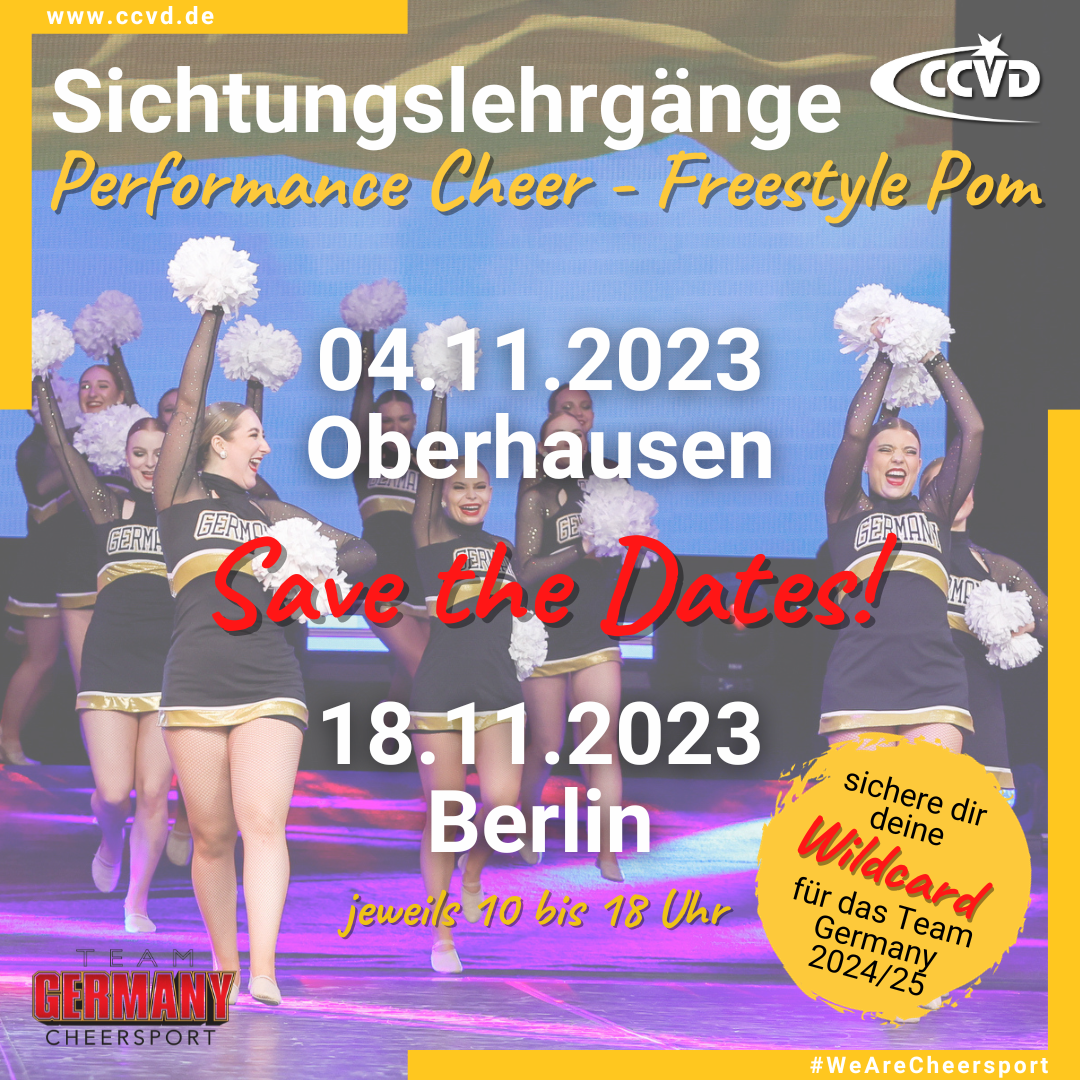 Alle weiteren wichtigen Informationen zu den Sichtungslehrgängen erhaltet ihr nach eurer Anmeldung zu gegebener Zeit per E-Mail. Worauf wartet ihr also noch? Meldet euch JETZT zu einem der beiden Sichtungslehrgänge für das kommende Performance Cheer Freestyle Pom Nationalteam an!