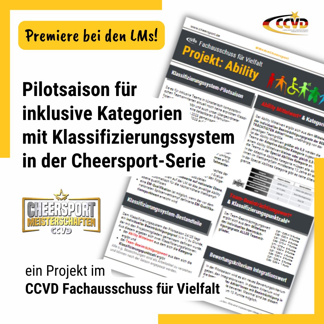 Mit dem großen Engagement und dem Erfahrungswissen der Coaches von inklusiven Cheer-Teams im CCVD, dem fachlichen Input des Deutschen Behindertensportverbandes, Special Olympics und medizinischen Experten und im Austausch mit Cheerleading-Verbänden aus anderen Ländern sowie unseres Europa- und Weltverbandes ist es gelungen, im Rahmen eines Pilotprojektes in dieser Saison erstmals Ability Kategorien mit einem Klassifizierungssystem auf der Cheersport-Serie anzubieten.